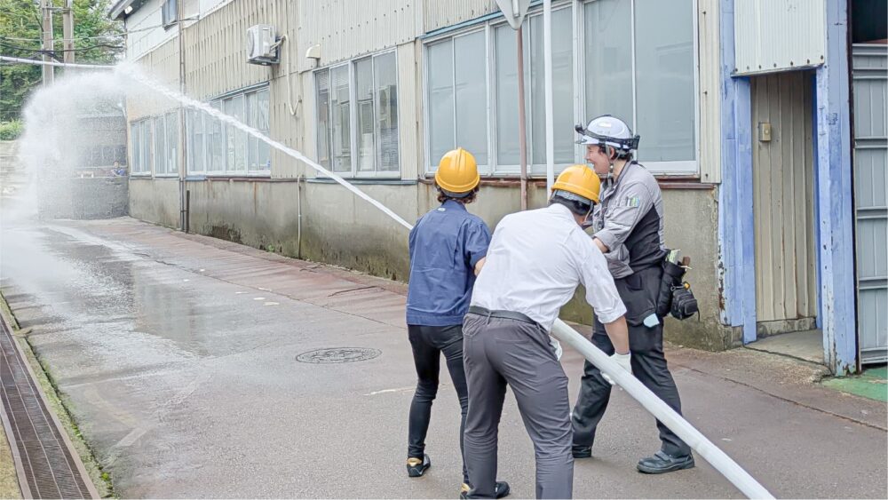 その後は、消火栓や消火器を使用した放水訓練を実施し、実際に手を動かすことで初期対応の重要性を再確認しました。