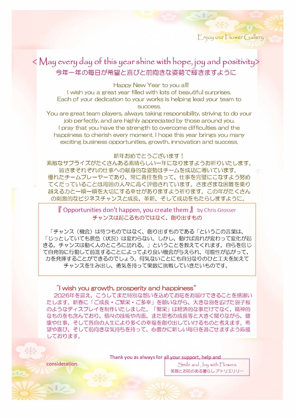 2026年という新たな一年が、皆様にとって喜びに満ちた年になりますよう、心よりお祈り申し上げます。