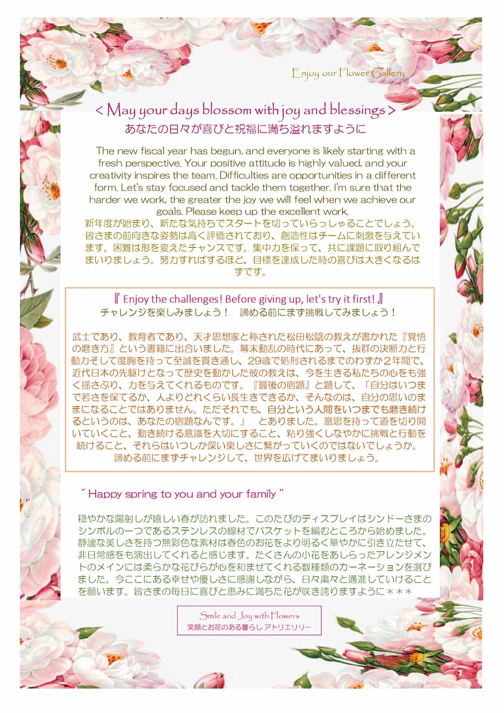 今回も、新年度を迎える私たちへ向けた心強いメッセージをいただきました。